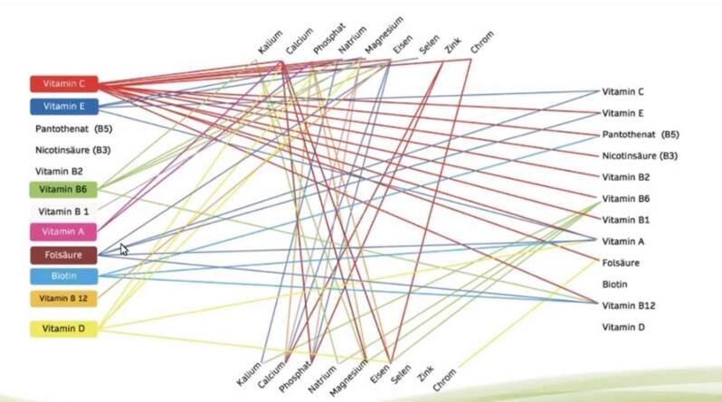 Lifeplus nutzt die Synergien der Vitalstoffe miteinander optimal aus. Die Abbildung zeigt, dass sich die Vitalstoffe wechselseitig brauchen - Isolierte Produkte werden schlechter verstoffwechselt und die nährstoffe damit nicht ideal vom körper aufgenommen.