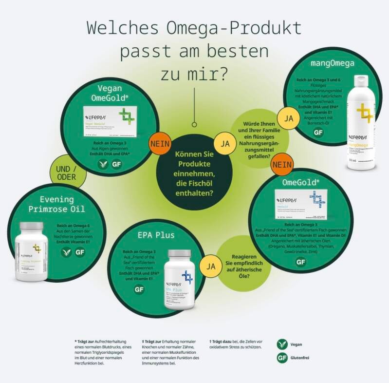Lifeplus bieten verschiedene Formen zur Ergänzung mit Omega 3 an. Es gibt auch eine vegane Alternative und eine flüsssige Variante mit Mango-Geschmack.